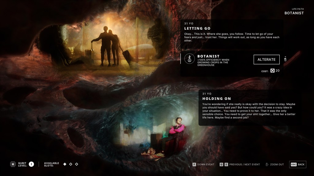 The most central and innovative mechanic in The Alters is undoubtedly the creation and management of the Alters. This process is not just the backbone of its gameplay but the very vehicle for its philosophical inquiry. Using a strange substance called Rapidium in conjunction with a quantum computer in the base, the player accesses an interface known as the “Tree of Life.” This tree is not a traditional skill tree but a map of Jan Dolski’s life trajectory, marked with its pivotal turning points. The player must select one of these forks in the road—a life-altering decision—to create an Alter who, at that moment, made a different choice and thus walked a completely different path.